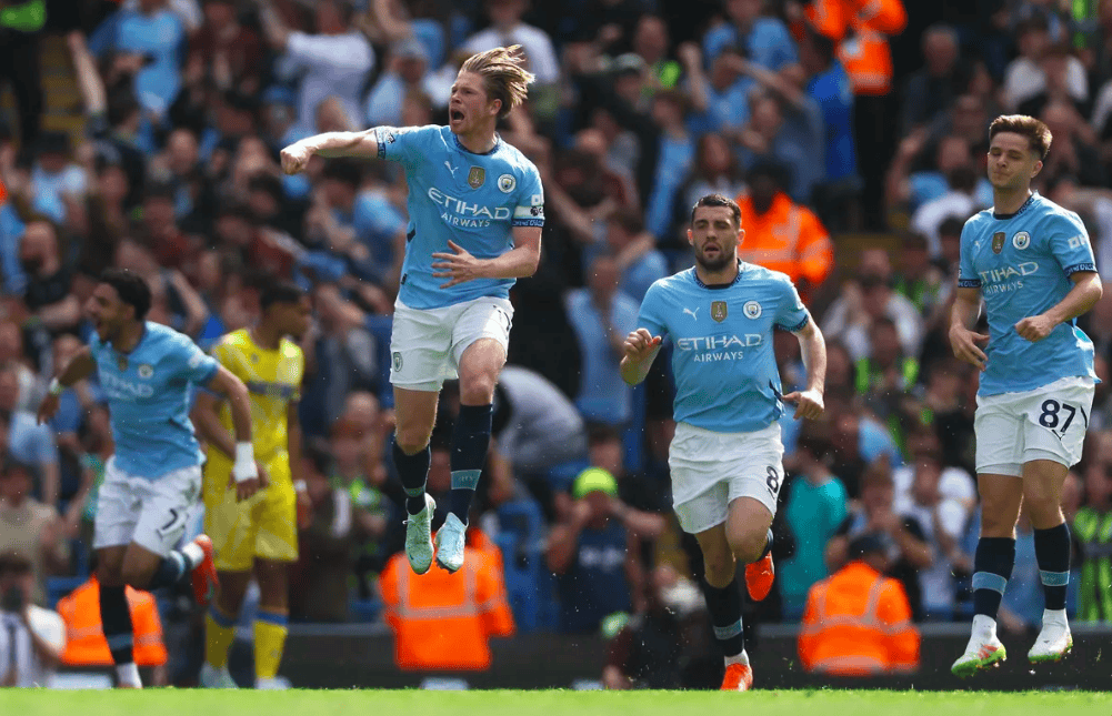 第33分钟,曼城获得前场任意球,蓝月亮拆人墙战术成功,德布劳内主罚直接破门。